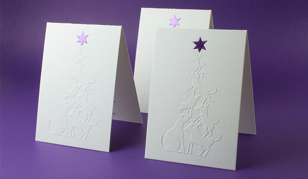 Last year, our loyal mates at KW Doggett invited us to print their 2015 Christmas card on their stock, Wild. Wild is an Italian-made paper that lends itself to embellishment, because of it’s high bulk, cotton fibres that reveal a sharp impression, and Doggetts wanted to showcase this capability. We used CLIQX to achieve the crisp, eye-catching letterpress result finishing the cards with a combination of blind embossing and foiling in the Doggetts signature purple.